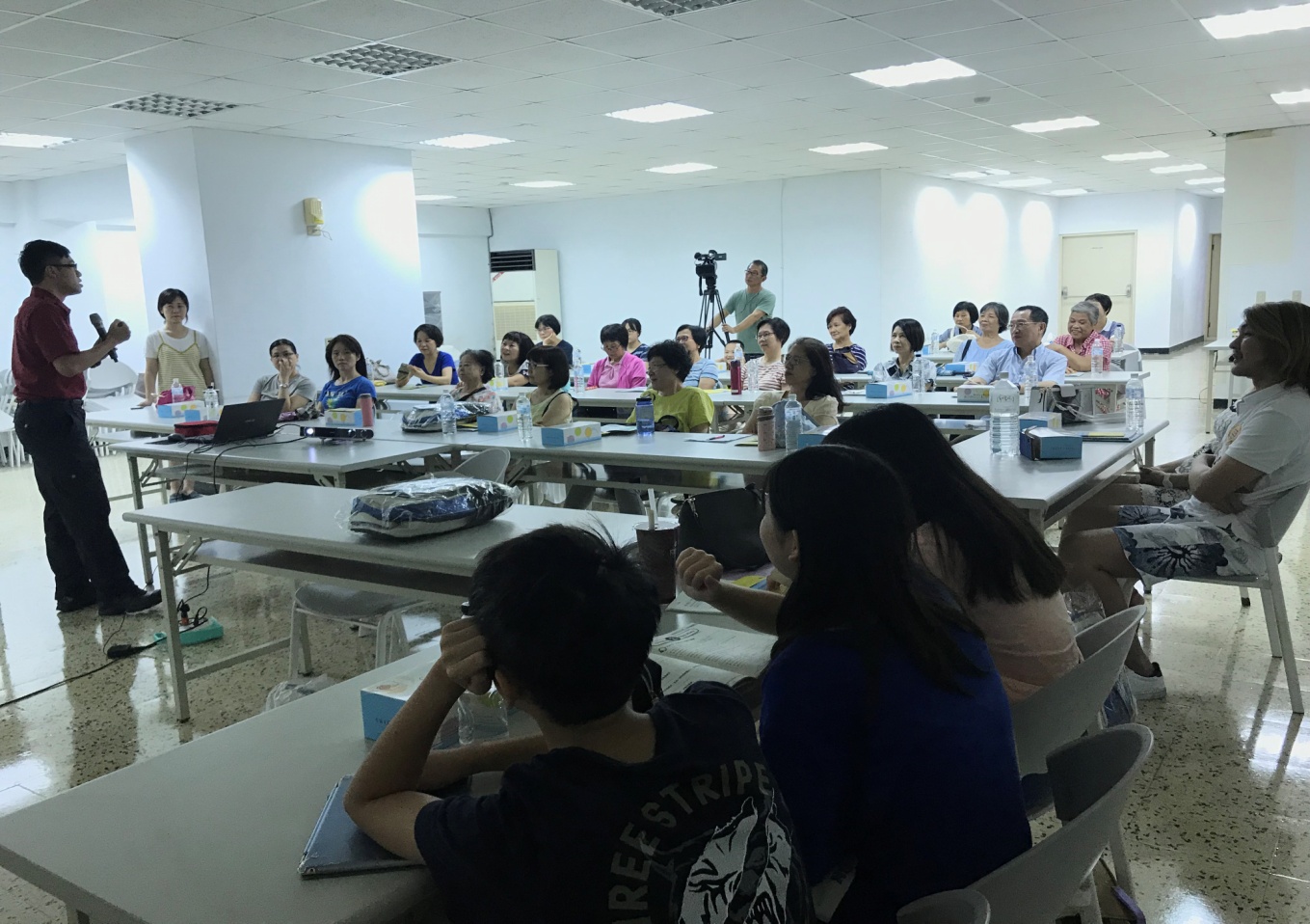 本次邀請中華分隊消防技師透過影片,告知火災首要大喊失火通報旁人逃生,研判起火地點,不要慌張往外跑躲在家反安全,還有要關門延長逃生時間,通報119及遇濃煙要低姿勢沿牆壁逃生,技師也教導滅火器操作要領。