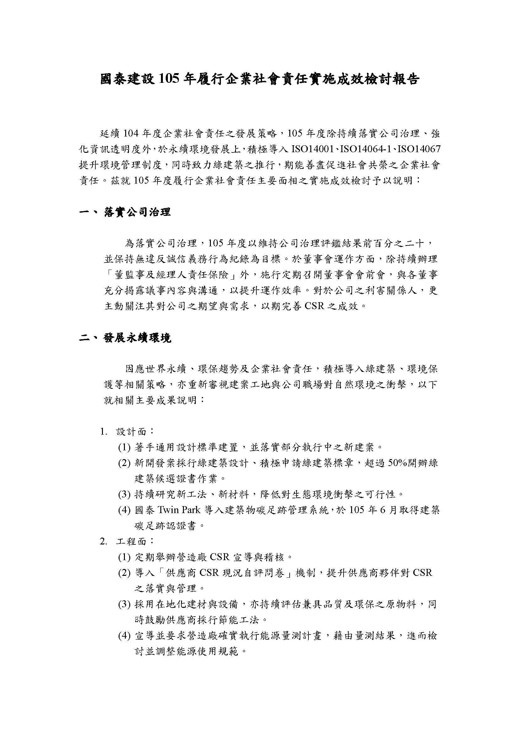 國泰建設105年履行企業社會責任實施成效檢討報告