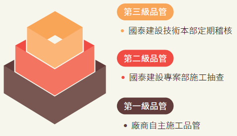 國泰建設透過「三級品管制度」構築完善的品質管理機制,明確劃分三階段的權責與查驗角色,層層把關、確保建案品質穩健無虞。第一級品管要